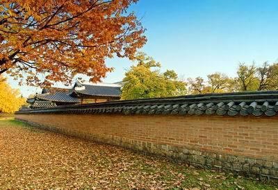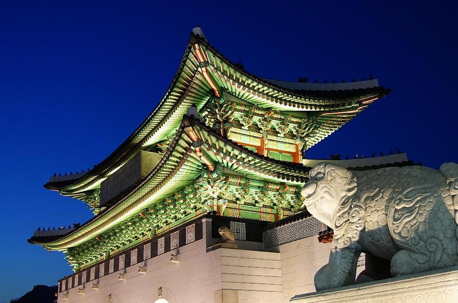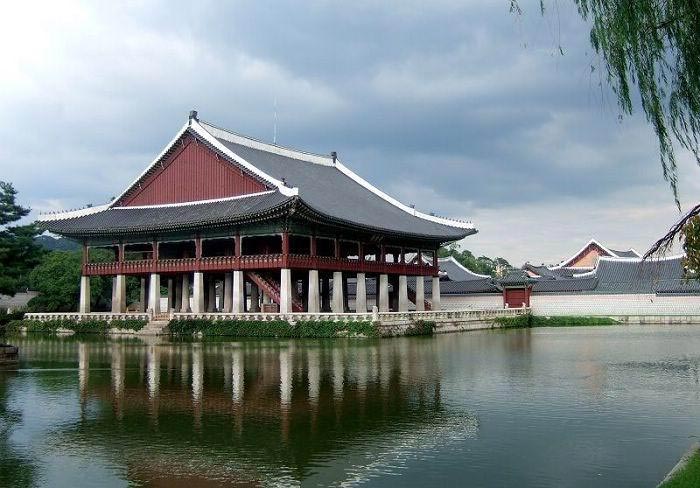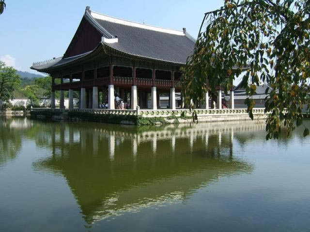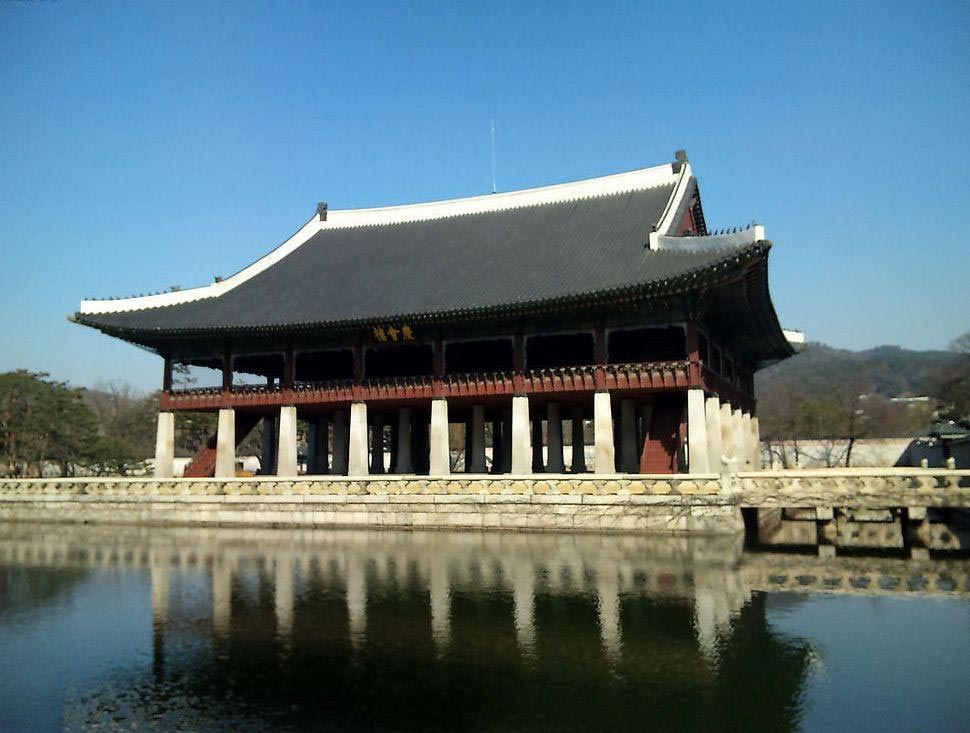 1392年李成桂建立朝鲜,定都今日的汉城,即朝鲜历史上著名的李朝,景福宫是当时的皇宫。四周建有宫墙,东西南北各开宫门,宫内呈前朝后寝,后设花园的布局。据《朝鲜通史》记载,1866年大院君专政,曾重修景福宫,历时两年,耗资二千五百万两白银。由此可推测景福宫全盛时期的规模和奢华程度。今天,宫内原有的二百多座建筑仅剩十余。主体建筑勤政殿,重檐歇山顶,是李朝皇帝坐朝议事和举行大典的“金銮殿”。勤政殿四周建有宽敞的围廊,后面又有三个小殿,再往后是寝宫,现已不存。勤政殿西北方向有一方池,池中砌有三台,最大的台上建有两层的庆会楼,另外两个台上栽植树木。景福宫最后是御花园,园内有方形水池,建一亭名为“香远”,入夏池内盛开荷花,应取汉文化中“香远益清”之意吧。和中国北京金碧辉煌的紫禁城相比,景福宫则显得有些“平民化”,让人感到朴实亲切。