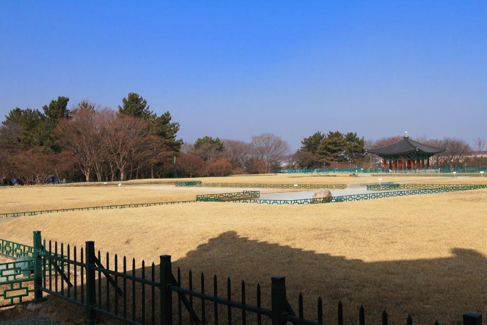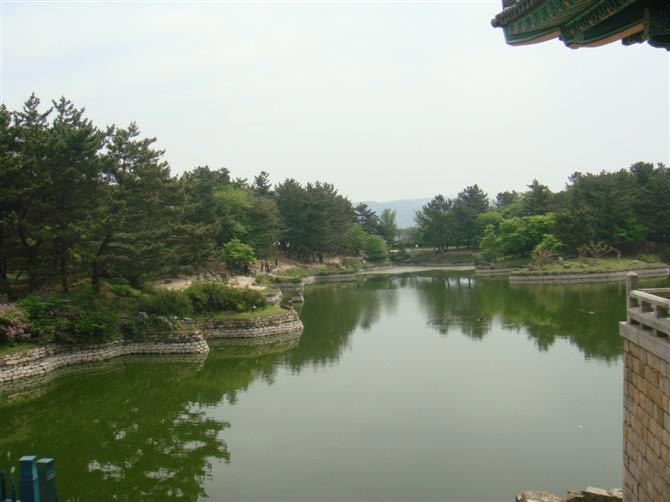 据《中国古典建筑史》记载:“唐代园林发展曾影响日本和新罗。新罗文武王作苑圃,于苑内作池,叠石为山,以象巫山十二峰,栽植花草,蓄养珍禽奇兽。据考证:庆州东南雁鸭池即为当时苑圃的遗址。”由此清晰可见雁鸭池的渊源。此园建于文武王14年(即674年),后毁于战乱,1975年复原。据考,园内水池中曾堆三岛,分别象征蓬莱、方丈、瀛洲三神山,象征巫山的十二峰分别位于池北和池东,沿池共有十二座建筑。雁鸭池曾是新罗王子的东宫,每逢喜庆节日,王子都要在园内大宴宾客,歌舞升平。现在雁鸭池园内只重修了水池,三座岛屿和池西的三座建筑。雁鸭池理水颇为成功,水池略为方形,占地约十余亩。由于得当地布置了三个岛和两个伸入水面的半岛,使水面或开阔舒朗或潆洄幽深,收放自如,颇具天成之趣。特别是池东北、东南巧妙地运用了“藏源”的手法,起到了延伸空间、变换景致、小中见大的作用。