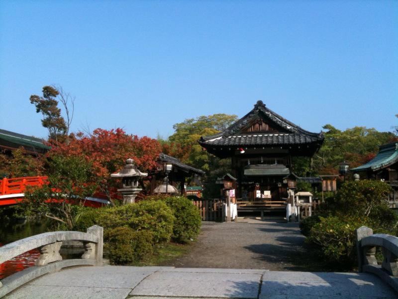 虹桥木构,一跨如虹,鲜红的色彩十分醒目。中岛与南岸以石拱桥相接,南面正门为石鸟居(牌坊)。南墙为石栏杆。水面的西北部建舟舫一只,为画舫形式,船头雕成首。