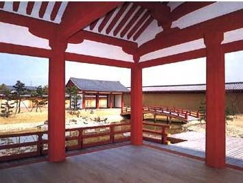由此可见,奈良时代庭园的特点是池庭铺鹅卵石,又称玉石,岸线喜欢出半岛,同样铺以玉石,成为洲浜。池中筑岩岛,北岸构建筑,与岩岛形成轴线,水口架桥以划分水面。曲水流觞的做法在奈良时代就已盛行。